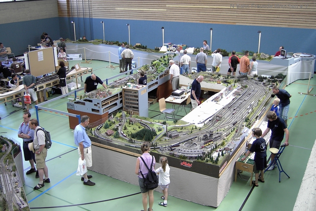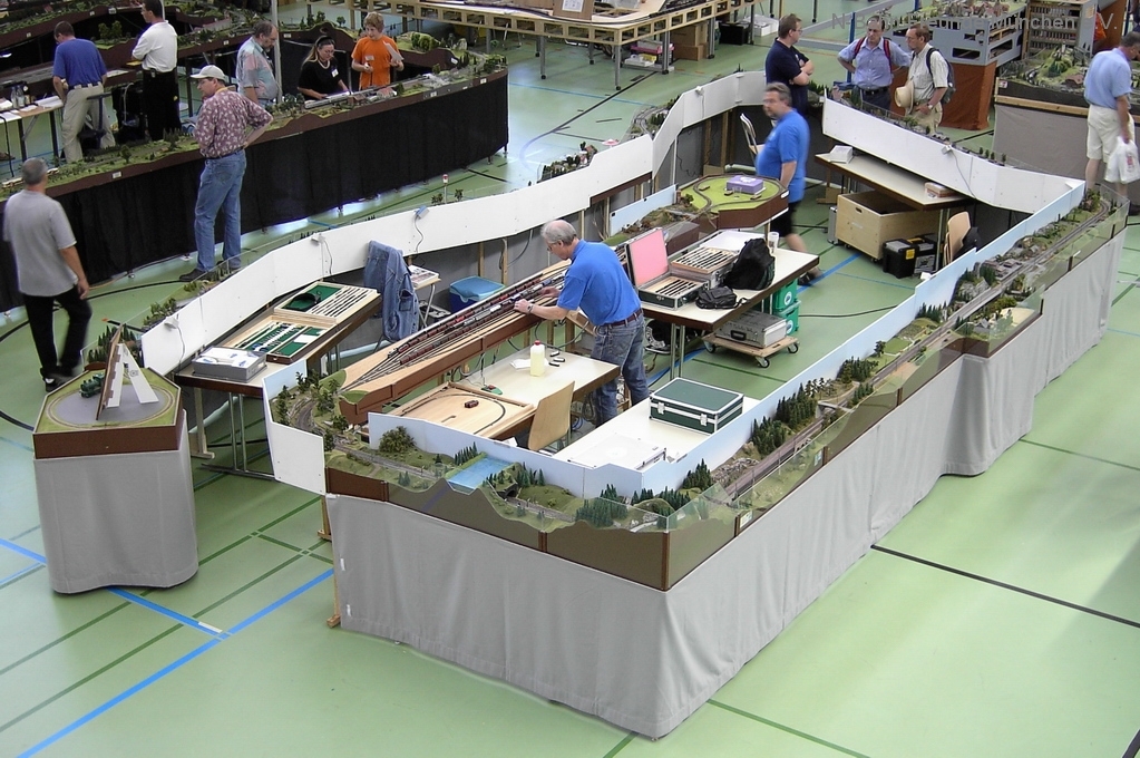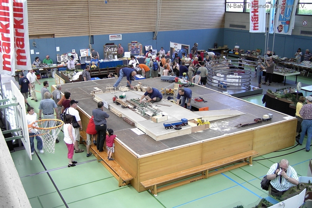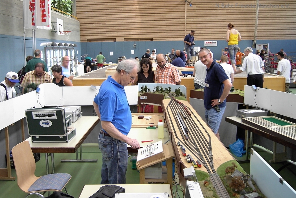 Wenn die große Bahn etwas zu feiern hat, wird in vielen Fällen ergänzend eine attraktive Modellbahnausstellung organisiert. So geschehen auch bei 100 Jahre Lokalbahn Amstetten- Gerstetten. Die Ulmer Eisenbahn Freunde hatten uns schon letztes Jahr zu diesem Jubiläum eingeladen und wir konnten inmitten der großen Aurainhalle eine mittelgroße übersichtlich geplante Anlage mit 34 Modulen und einer Gleislänge von ca. 100 m vorstellen. Etwas unsicher gestalteten sich wieder mal die Vorbereitungen bezüglich Quartier, Transport und Bezahlung und Andreas Brustkern hatte seine liebe Mühe, alles unter Dach und Fach zu bekommen. Wobei sich der Transport der Ausrüstung per Wechselauflieger nachträglich als recht vorteilhaft herausstellte. Auch Unterkunft und Verpflegung waren dann in Ordnung.