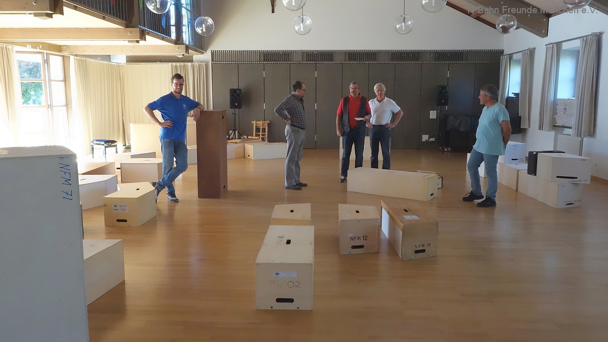 Mehrere aktive Mitglieder fanden sich am Freitag, den 12. Oktober 2018 im Vereinskeller in Gröbenzell ein, um den gemieteten LKW mit den vorbereiteten und verpackten Modulen zu beladen. Einige Vereinsmitglieder zerpflückten auch ihre heimischen Anlagen und stellten für unsere Ausstellung ihre Module zur Verfügung.