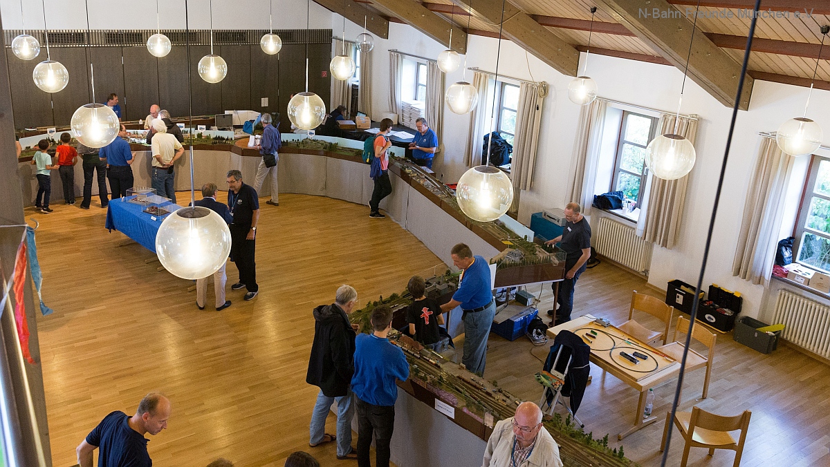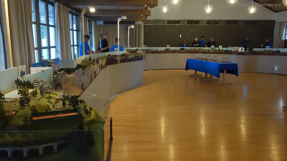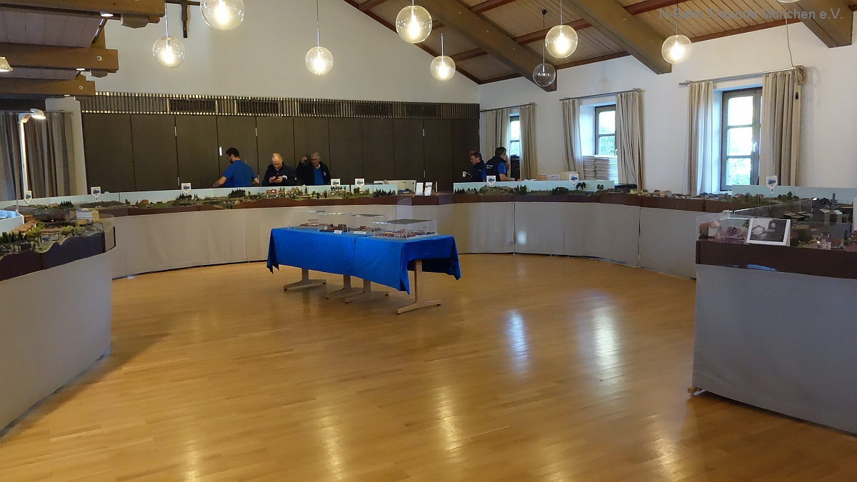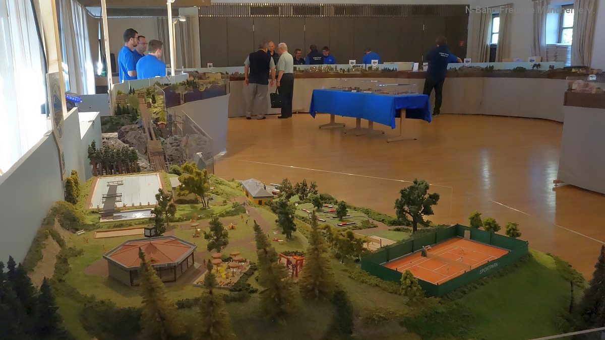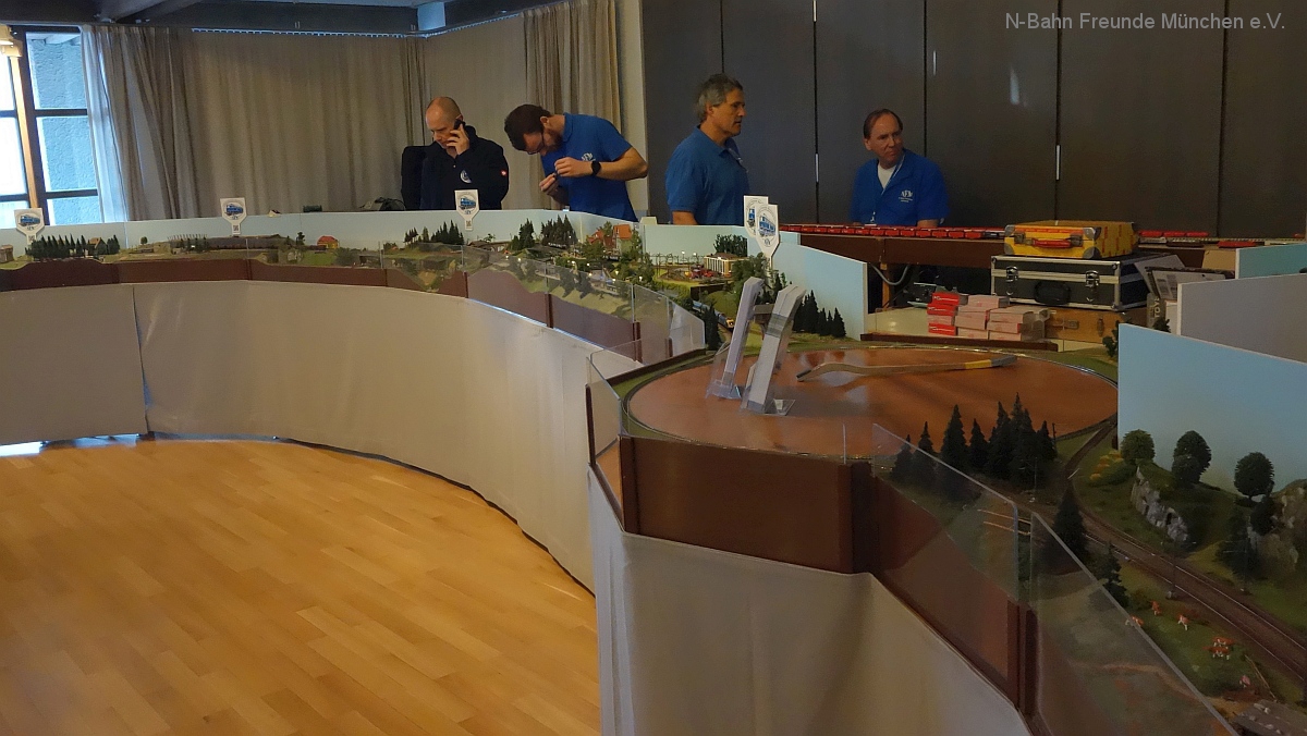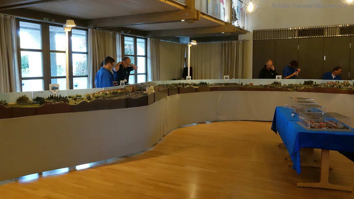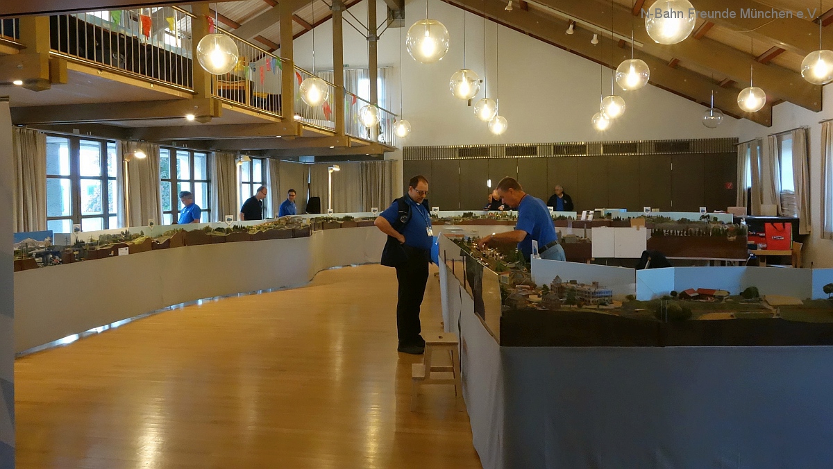 Als Gast begrüßten wir die „GermaNTrak“, sie bauten auf der Empore des Pfarrsaals eine interessante kleinere Anlage auf, wo ausschließlich amerikanische Züge zum Einsatz kommen sollten.
