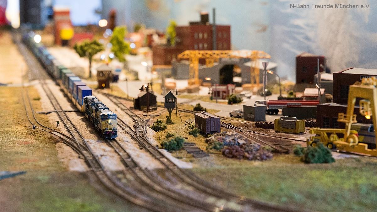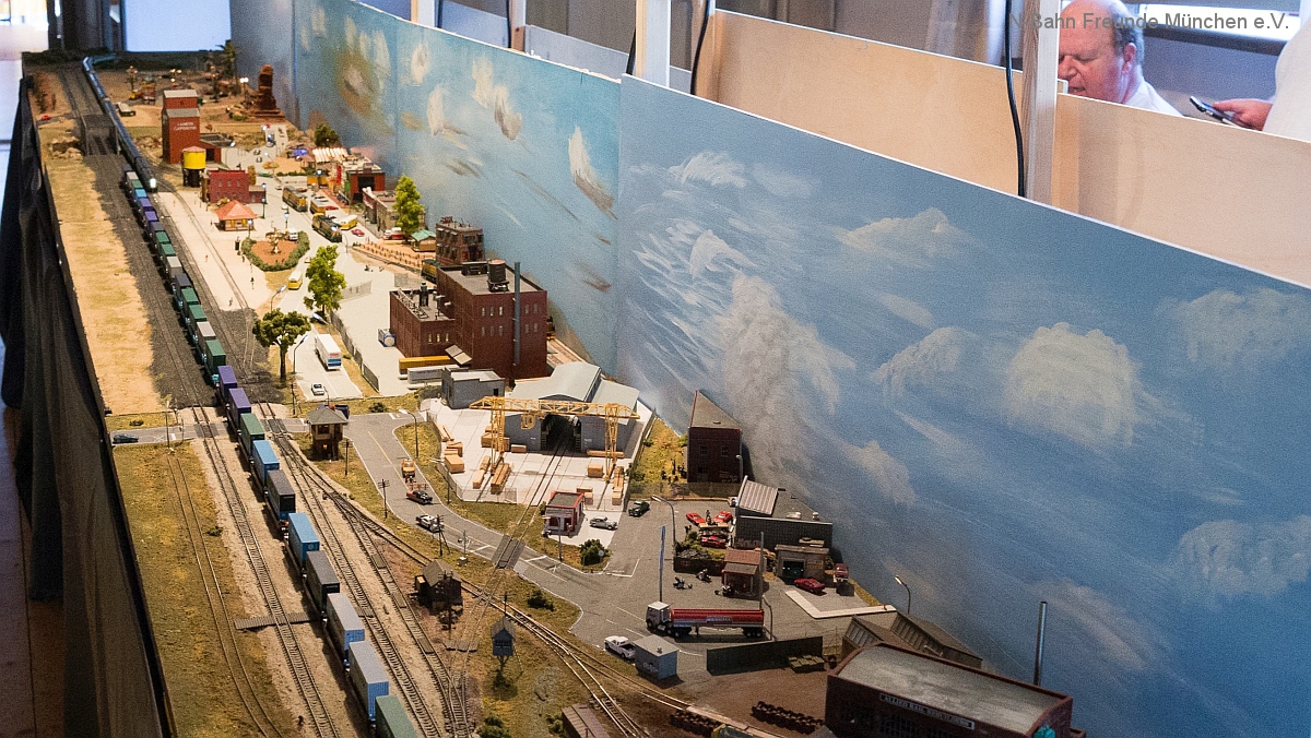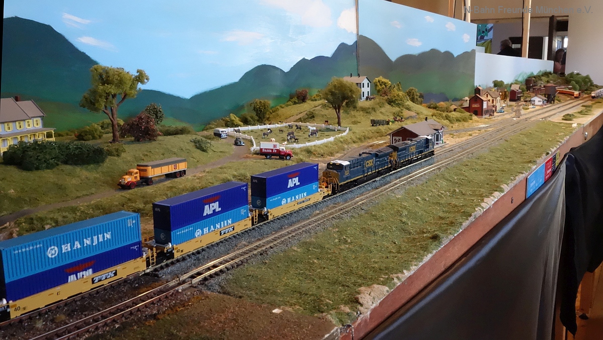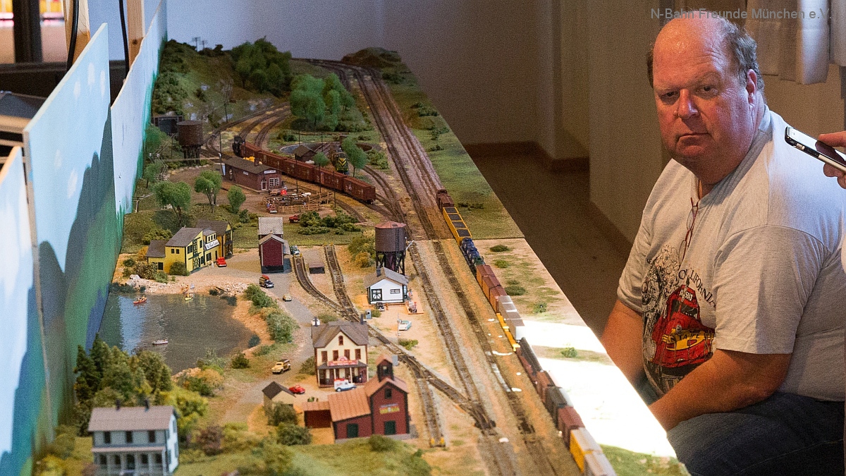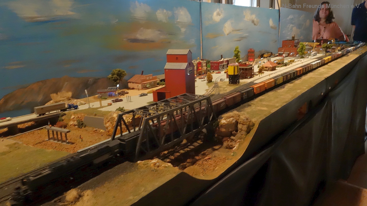 Als Gast begrüßten wir die „GermaNTrak“, sie bauten auf der Empore des Pfarrsaals eine interessante kleinere Anlage auf, wo ausschließlich amerikanische Züge zum Einsatz kommen sollten.