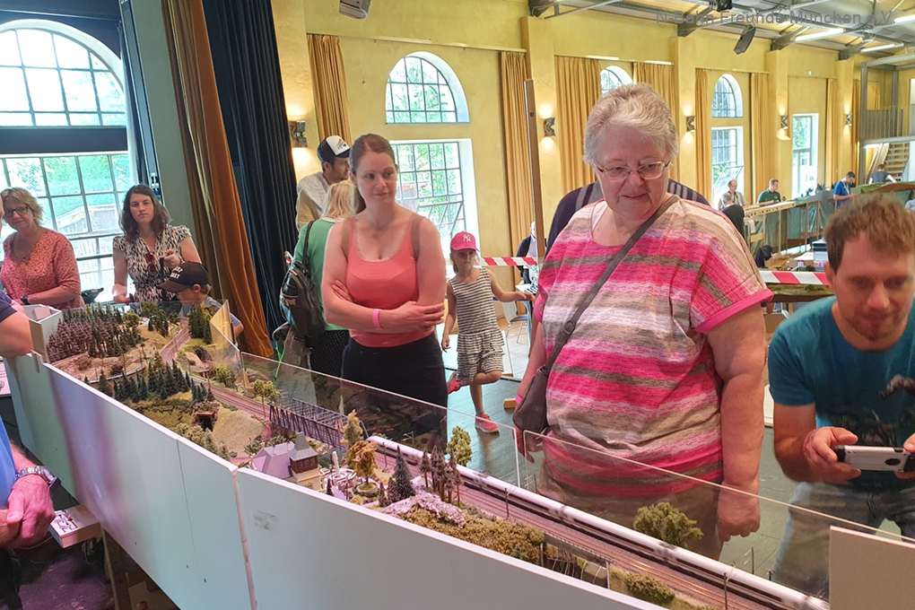 Neben vier altbewährten Modulen mit einer Schmalspurbahn wurde auch das ganz neu erstellte Modul „Schloss Höhenried“ sowie das überarbeitete Modul „St. Anna“ präsentiert. Das brachte Besucher immer wieder dazu lange stehen zu bleiben und den Zügen zuzusehen, welche sich auf einer sehr kurvenreichen Strecke über sechs Module mit Haltepunkten, Bahnhöfen und Betriebswerk – sich in wirklichkeitsgetreuer gemütlicher Geschwindigkeit – durch eine liebevoll ausgestaltete Landschaft schlängelten. „Wo kommt denn der Zug wieder raus“, fragten nicht selten Kinder und Jugendliche, wenn der langsam fahrende Zug in einem Tunnel verschwand und es auf den ersten Blick nicht klar war, aus welchem der verschiedenen Tunnelöffnungen er wieder heraus kommt. Immer wieder konnten, wollten und durften Markus Birner und Walter Rauffer den Besuchern Rede und Antwort stehen, denn; so eine Schmalspurbahn bekommt man selten zu sehen.