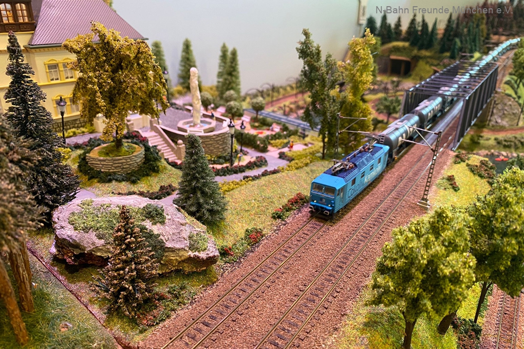 Insgesamt 18 Module präsentierten die NFM auf der Bühne der Tiefstollenhalle Peißenberg. Zwischen zwei Wenden konnten zahlreiche Personen- und Güterzüge auf die zweigleisige Hauptstrecke geschickt werden.