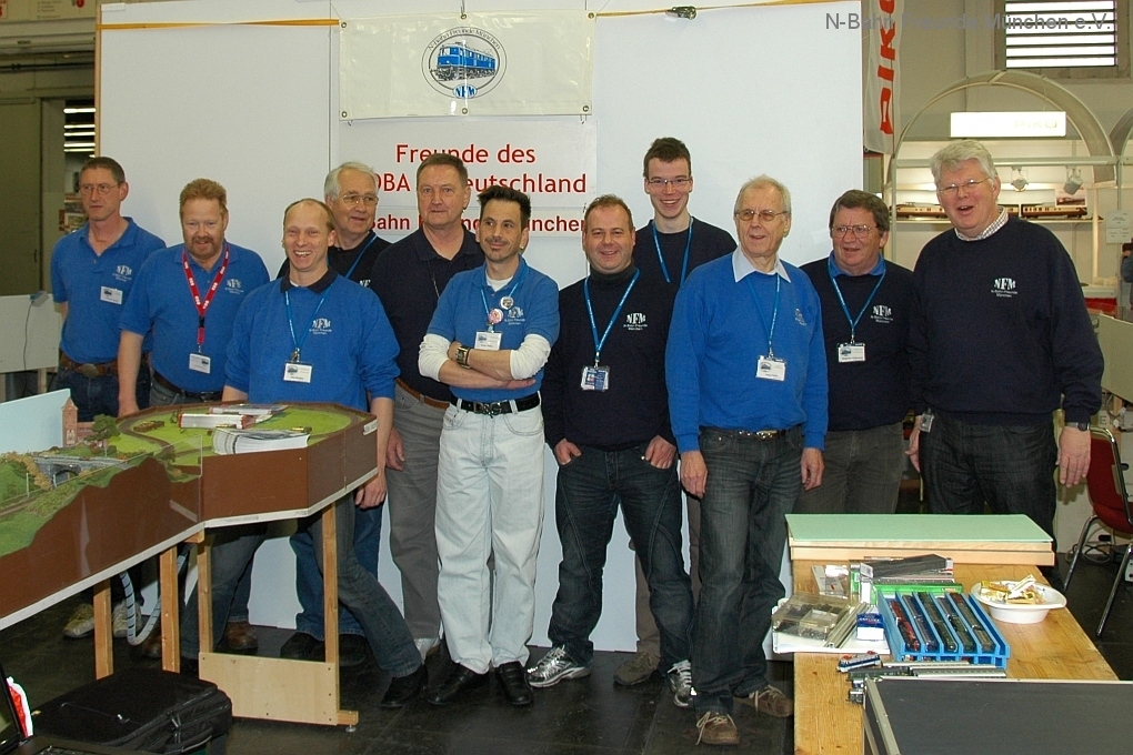 Wir, die N-Bahn Freunde München, waren in Halle 7 mit 38 Modulen dabei. Zu sehen war eine 2-gleisige Hauptstrecke mit ca. 35m Strecke inkl. Bahnhof und eine 1-gleisige Nebenbahn mit ca.12m Strecke und Bahnhof. Vornehmlich Module die noch nicht vorher in Dortmund zu sehen waren. Darüber hinaus hatten wir noch unsere Bauprojekte und Sponsoren mit ihren Produkten in einer Vitrine präsentiert.
