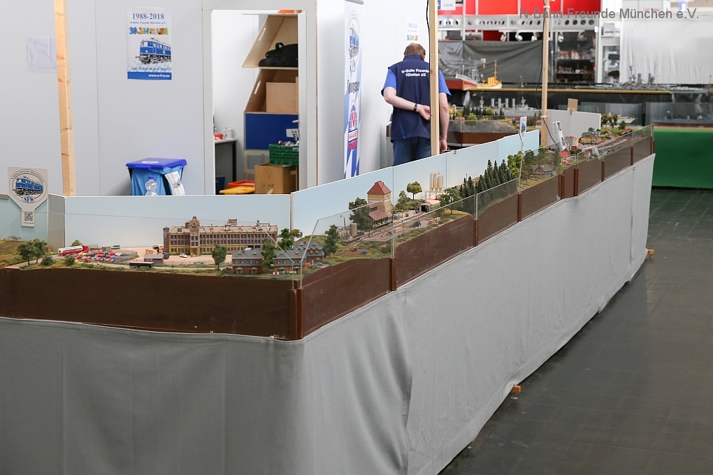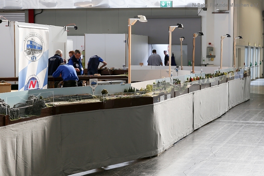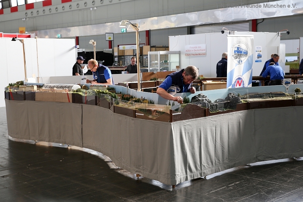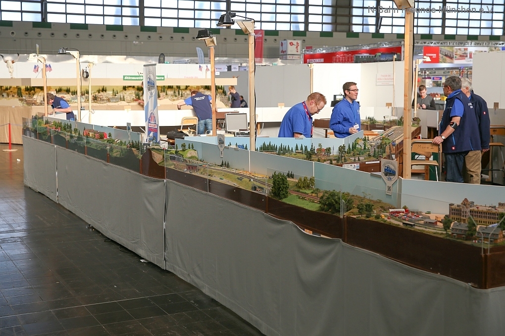 Zusammen mit 30 weiteren „ideellen“ Anlagen-Ausstellern hatten wir unsere weitläufige Modulanlage aufgebaut. Es waren alle gängigen Spurweiten vertreten, von Spur 1 (1:32) bis Spur Z (1:220). In Spur N (1:160) waren vier Anlagen ausgestellt. Fast alle Großserienherstellen und sehr viele Kleinserienhersteller hatten ihre Messestände in den Hallen 4 und 7 aufgebaut und zeigten ihr breites Produktportfolio und ihre Neuheiten.