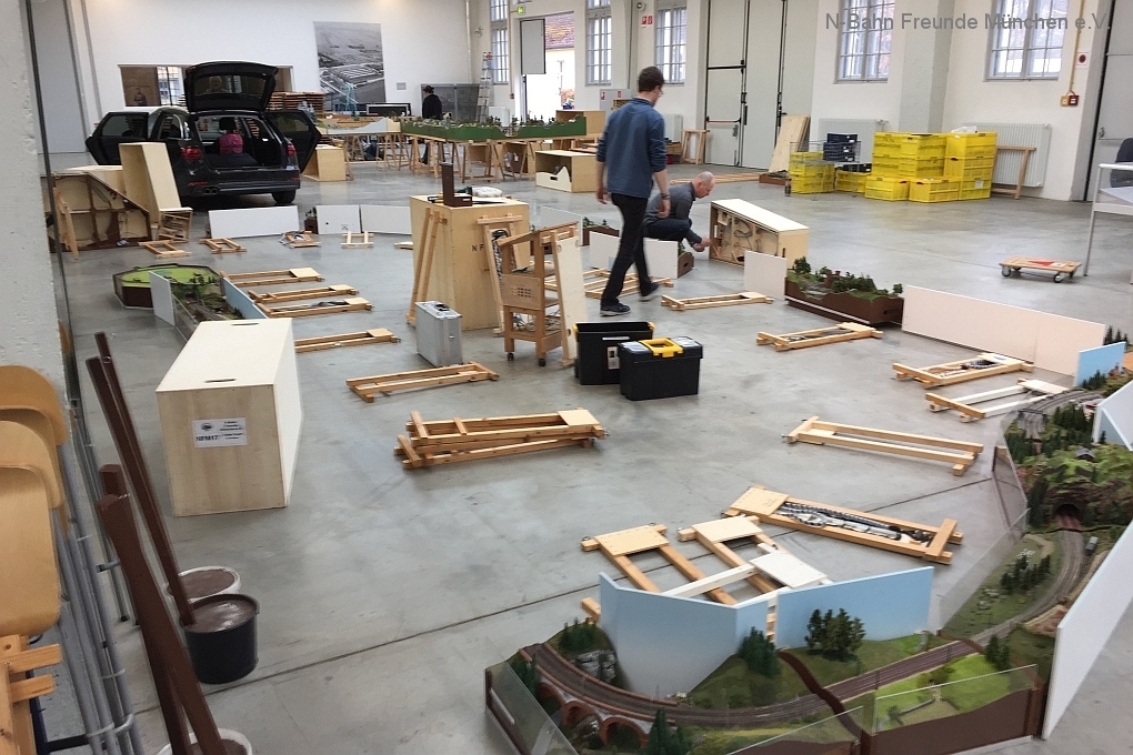 Bereits am Freitag den 24.03.2017 trafen sich einige Club-Mitglieder um 09:00 Uhr im Vereinsheim, um den „Sprinter“ mit den vorbereiteten Modulen und allem notwendigen Zubehör zu beladen. So konnten wir bereits um ca, 10:30 Uhr mit dem Aufbau unserer Anlage beginnen. Diesmal bestand sie aus ca. 50 Modulen und sollte ca. 20m x 6m groß werden. Es gelang dann, den Betrieb ab ca. 17.00 positiv zu testen, einem reibungslosen Ausstellungsbetrieb am Wochenende stand damit nichts mehr im Wege.