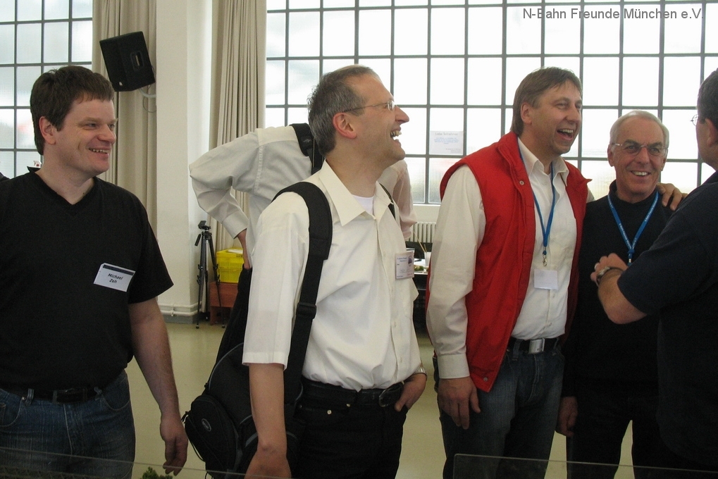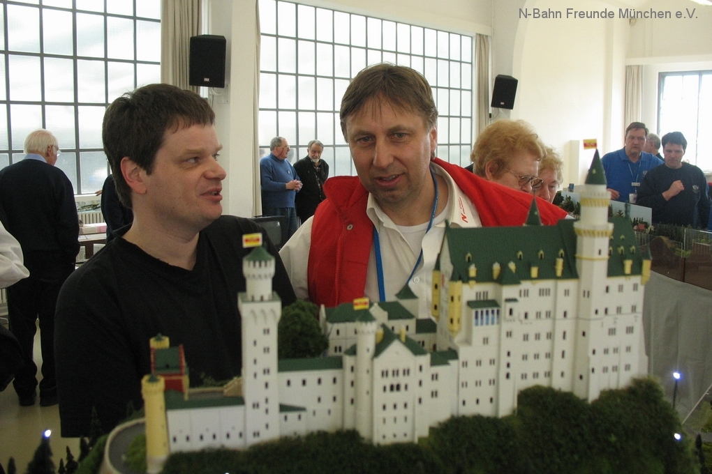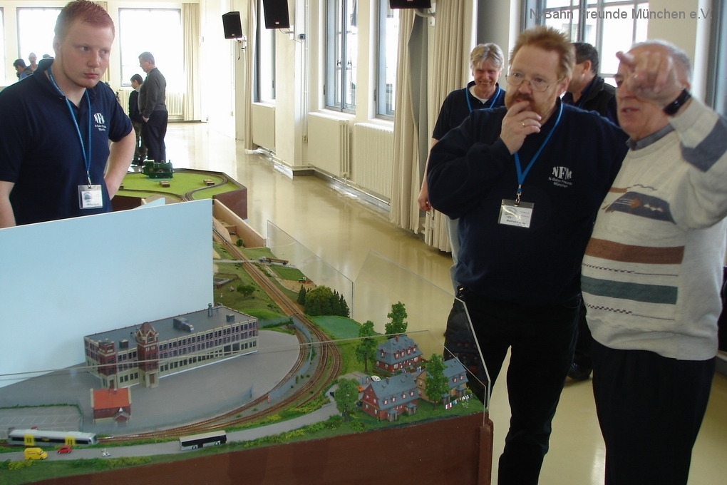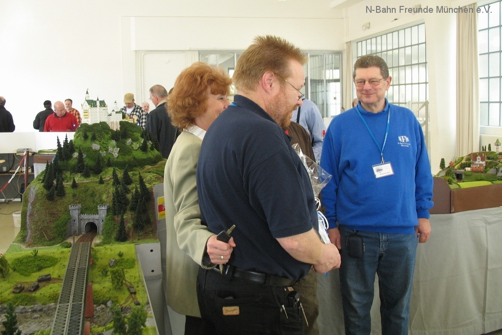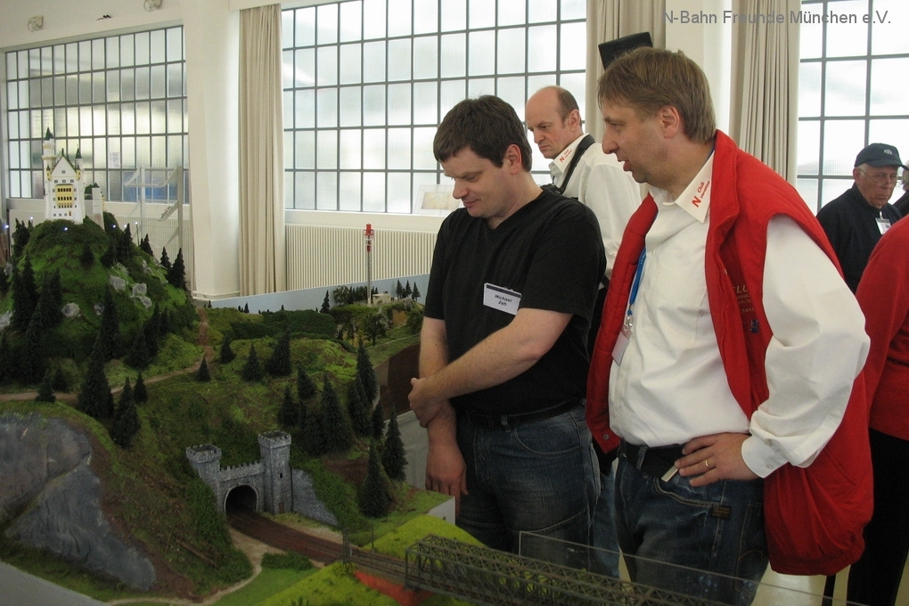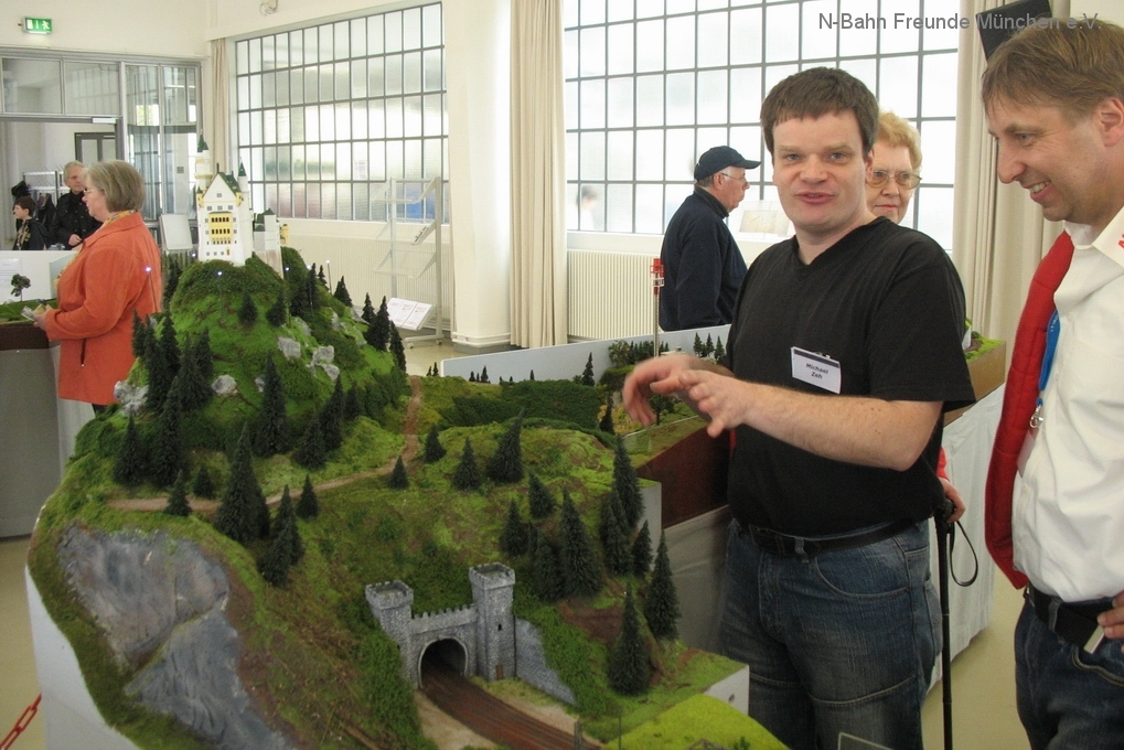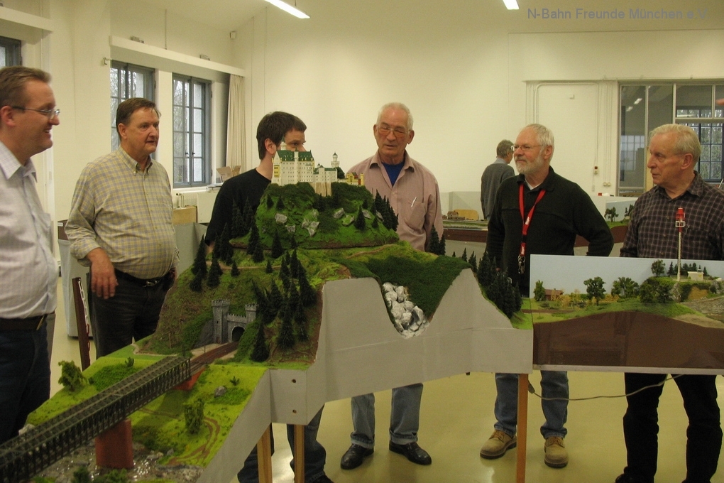 Somit veranstalteten wir zum runden Geburtstag eine Feier mit Freunden an einem gemeinsamen Wochenende in der Flugwerft des Deutschen Museums in Oberschleißheim. Wir zeigten dabei nicht nur eine NFM-Modulanlage im maximal möglichen Ausbau mit Themen aus dem Alltag aus den Epochen III bis heute, sondern hatten drei Module der N-Bahn Freunde Karlsruhe (Thema: Schloß Neuschwanstein) integriert.