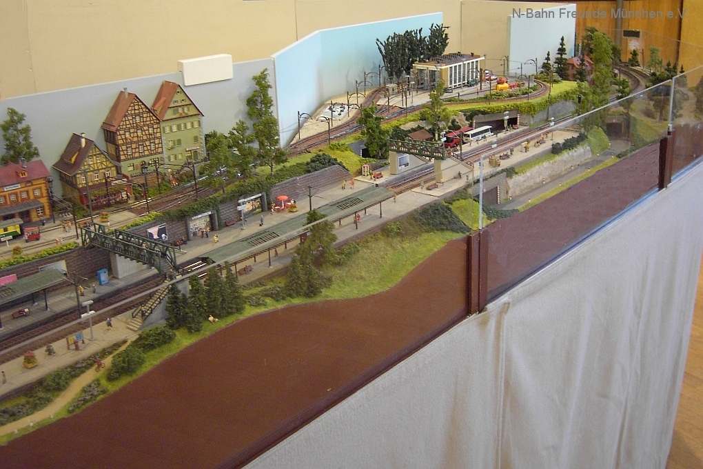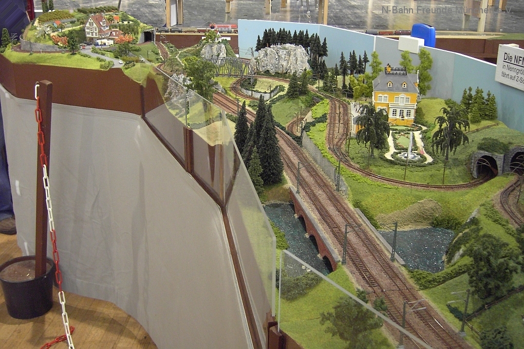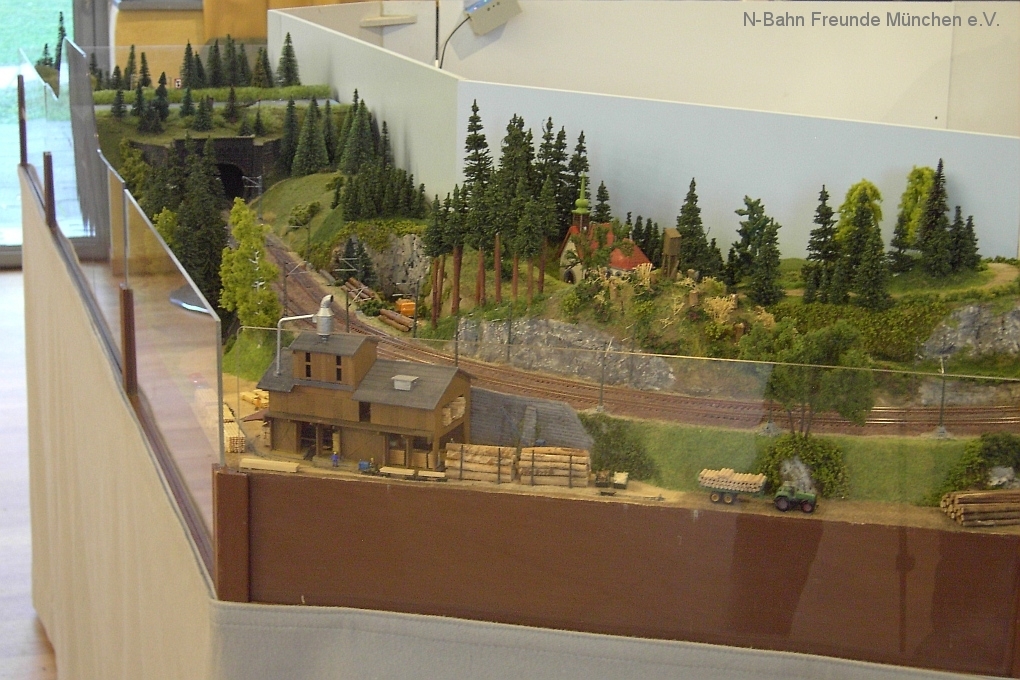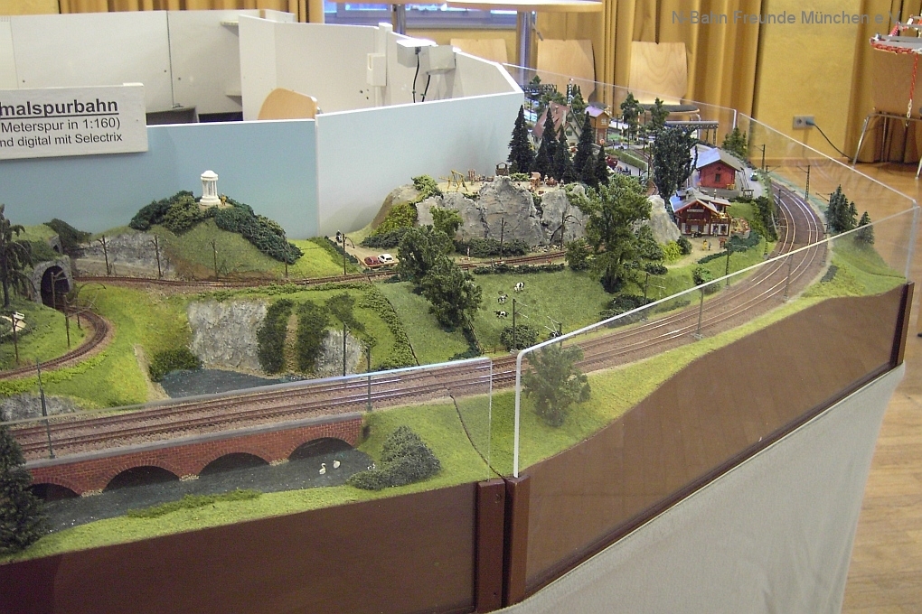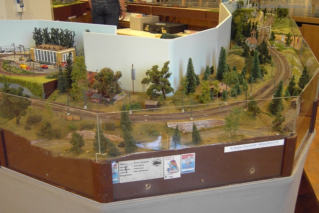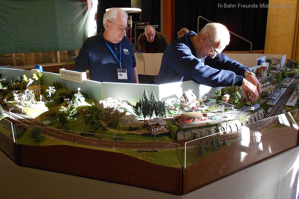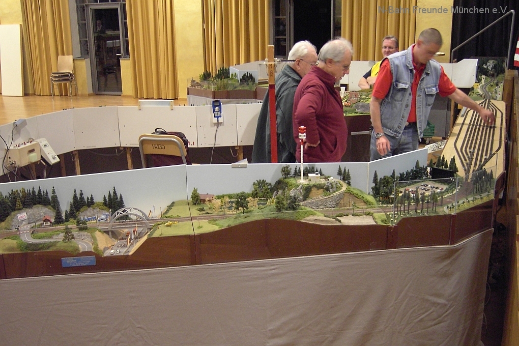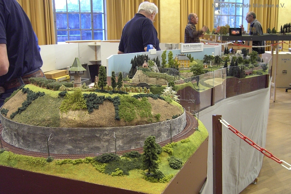 Auch die N-Bahn Freunde München konnten sich der ausgezeichneten Organisation des Veranstalters, dem MBC Pfaffenwinkel, erfreuen und waren mit einer kleineren Modulanlage über das Wochenende Gast in der großen Tiefstollenhalle in Peißenberg. Besonderes Interesse weckte der an 3 Seiten freie Zugang zur Anlage, die damit verbundene gute Verfolgbarkeit der abwechslungsreichen Zuggarnituren und die sich in vielen Kurven durch die Landschaft schlängelnde Schmalspurbahn. Ein Highlight war auch der Kamerawagen und die Wiedergabe der Lifebilder auf einem kleinen Bildschirm des Moduls Autokino und die Begeisterung war groß, wenn neben der Bahnstrecke auch noch Personen erkannt wurden. Von den ganz Kleinen auf Opa´s Rücken wurde neben dem Tunnelratespiel: Wo kommt denn der Zug wieder? auch immer der neue Abenteuerspielplatz entdeckt.