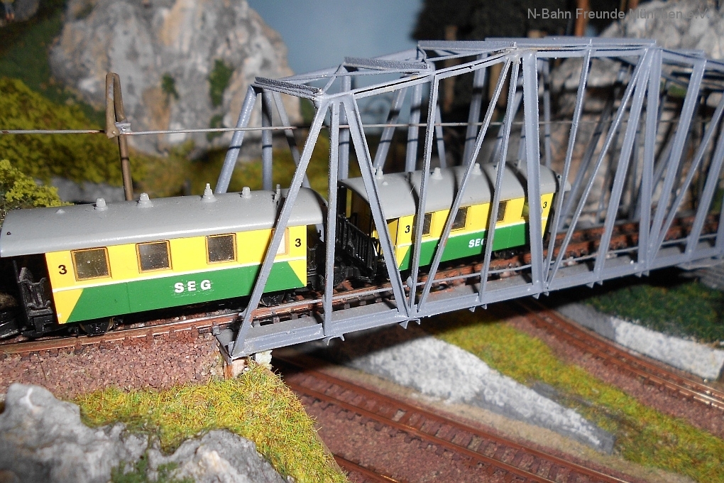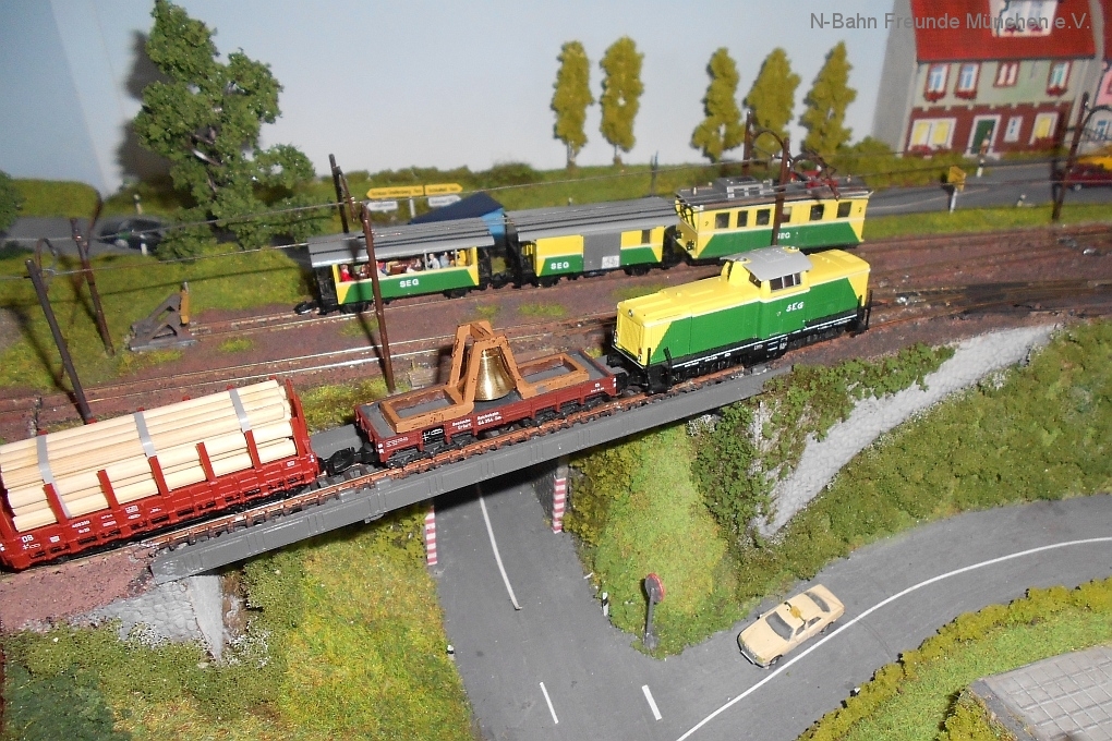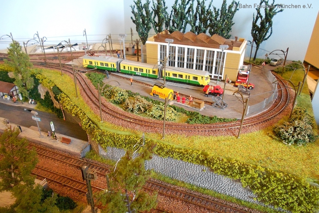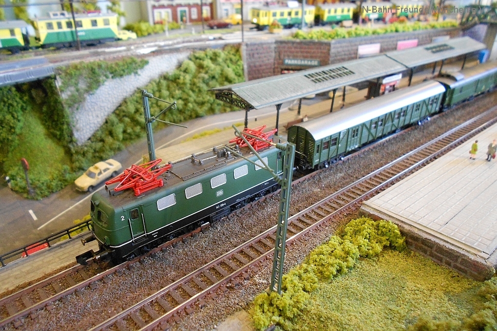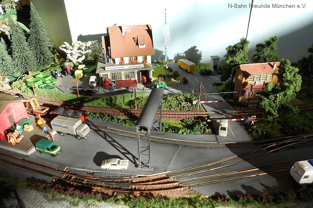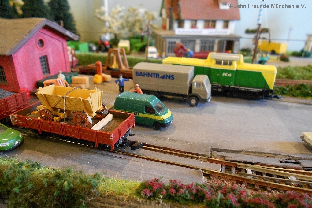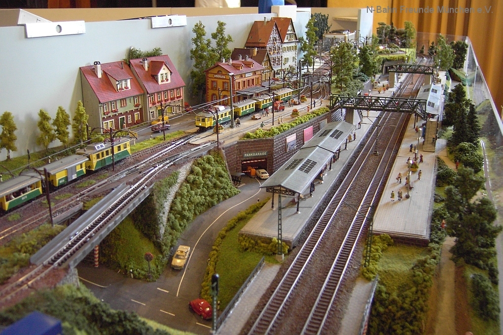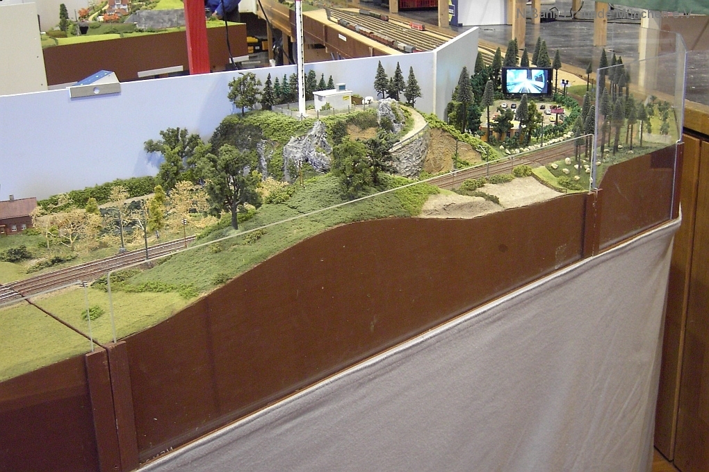 Auch die N-Bahn Freunde München konnten sich der ausgezeichneten Organisation des Veranstalters, dem MBC Pfaffenwinkel, erfreuen und waren mit einer kleineren Modulanlage über das Wochenende Gast in der großen Tiefstollenhalle in Peißenberg. Besonderes Interesse weckte der an 3 Seiten freie Zugang zur Anlage, die damit verbundene gute Verfolgbarkeit der abwechslungsreichen Zuggarnituren und die sich in vielen Kurven durch die Landschaft schlängelnde Schmalspurbahn. Ein Highlight war auch der Kamerawagen und die Wiedergabe der Lifebilder auf einem kleinen Bildschirm des Moduls Autokino und die Begeisterung war groß, wenn neben der Bahnstrecke auch noch Personen erkannt wurden. Von den ganz Kleinen auf Opa´s Rücken wurde neben dem Tunnelratespiel: Wo kommt denn der Zug wieder? auch immer der neue Abenteuerspielplatz entdeckt.