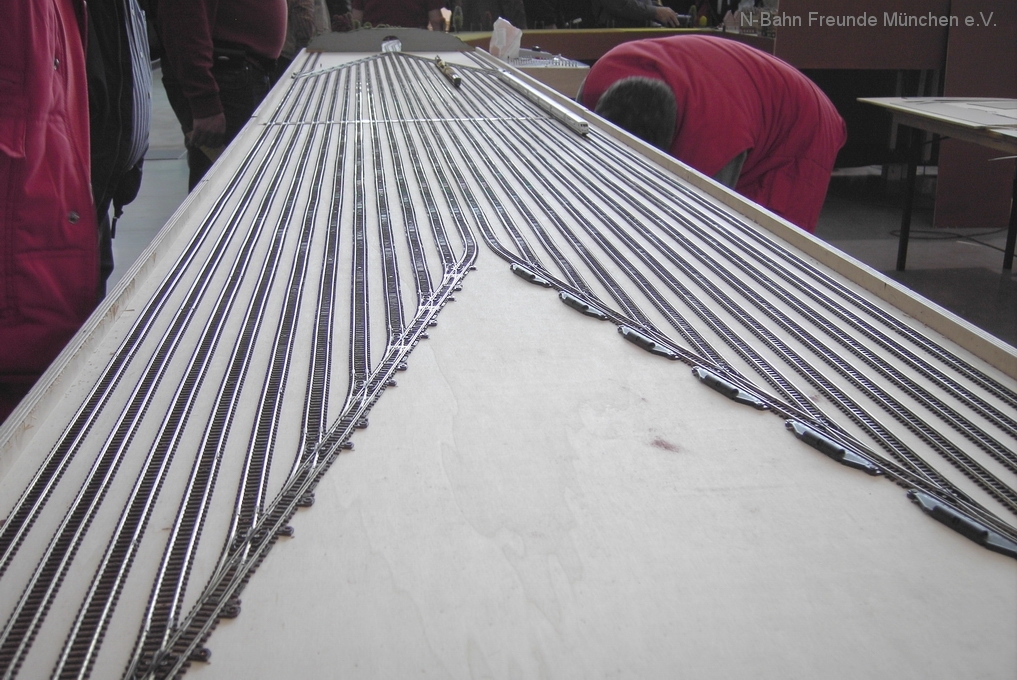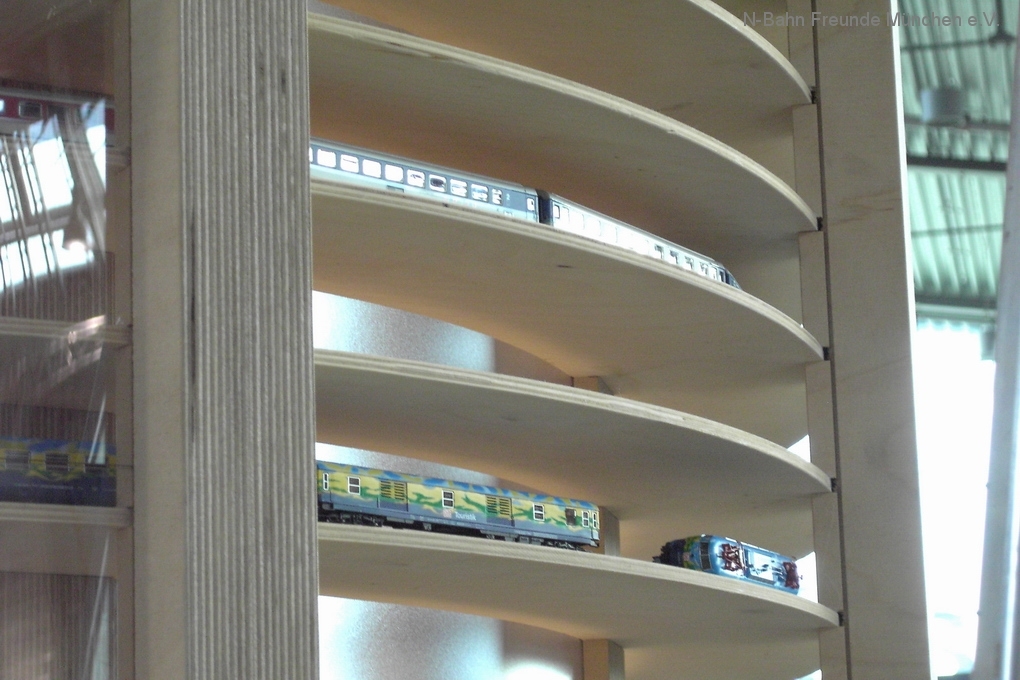 Es hat sich sicher für jeden Verein gelohnt, die teilweise doch sehr weite Anreise zu bewältigen, um Teil dieses Events zu sein. Wurde doch in diesem Jahr ein weiteres Highlight mit dem Tor zur N-Welt errichtet. Dieses überbrückte den Eingang in ca. 2,50m Höhe und verband (bestehend aus zwei Gleiswendeln sowie einer 4m langen Brücke mit einer Gesamtgleislänge von über 400m) die beiden Anlagenteile, so dass jedem Zug aus den teilnehmenden Anlagen das Befahren der anderen Anlagen ermöglicht wurde.