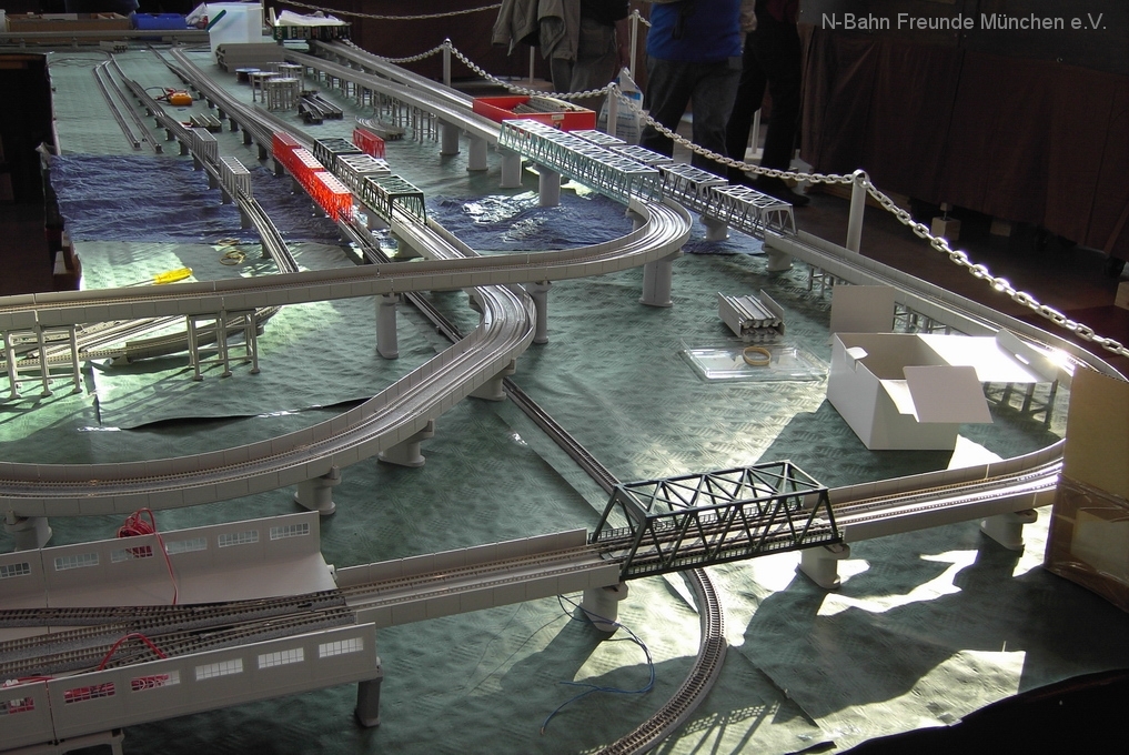 Es hat sich sicher für jeden Verein gelohnt, die teilweise doch sehr weite Anreise zu bewältigen, um Teil dieses Events zu sein. Wurde doch in diesem Jahr ein weiteres Highlight mit dem Tor zur N-Welt errichtet. Dieses überbrückte den Eingang in ca. 2,50m Höhe und verband (bestehend aus zwei Gleiswendeln sowie einer 4m langen Brücke mit einer Gesamtgleislänge von über 400m) die beiden Anlagenteile, so dass jedem Zug aus den teilnehmenden Anlagen das Befahren der anderen Anlagen ermöglicht wurde.